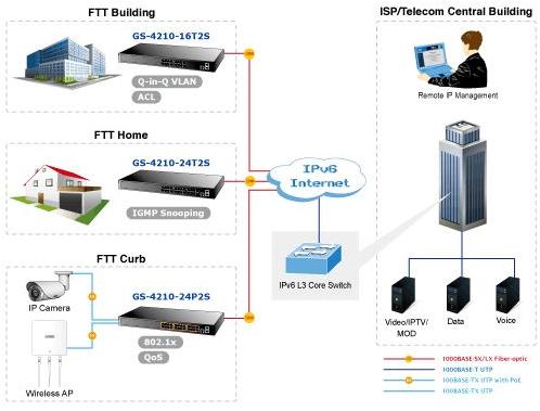 To build a network solution of FTTH (Fiber to the Home) or FTTC (Fiber to the Curb) for ISPs, and FTTB (Fiber to the Building) for enterprises, the various distances of SFP and Bidi (WDM) transceivers are optional for customers’ choices. For security and various applications, the 24 Gigabit ports of the GS-4210-24T2S can be configured with VLAN settings and connected to different units, offices, floors, houses and departments.