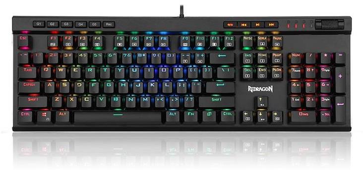 topThe Redragon Vata is a 104 keys anti-ghosting mechanical RGB gaming keyboard with macro keys and dedicated media controls. The Vata sports 18 backlight modes, 2 side lighting settings, as well as a highly durable and lightweight design due to its sleek aluminium alloy panel. This keyboard has OUTEMU blue switches with 50 million click durability and double-injection moulded keycaps. Waterproof and dust resistant.