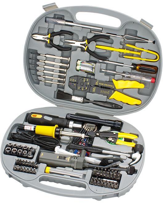 | Tool Listing | Reversible Ratchet Handle 42-pcs Terminals Tweezers 5pcs Sockets: 6, 7, 8, 9, 10mm 5pcs Sockets: 3/16“, 1/4“, 5/16“, 11/32“, 3/8“ 1-pc Philips: PH1 7-Bits: 1 pc Star: T8 1-pc Pozi: PZ1 5“ Long Nose Pliers 4 1/2“ Side Cutter Insulated Tape 2-pcs Batteries Blow Mold Case Mini Flashlight 3-Claw Parts Retriever 6-pcs Precision Screwdriver Set IC Extractor 2-pcs Slotted: 4, 6 mm 7-Bits: 4-pcs Star: T10, T15, T20, T25 Mini Hammer 9-pcs Allen Wrenches Vacuum Cleaner Set with Attachments Solder Reel Solder Wick 8“ Crimping Tool Brush Soldering Iron Cable Ties Magnetic Telescoping Pick-Up Tool 4-pcs Tri-ing: 1, 2, 3, 4 3-pcs Torq: 6, 8, 10mm 1-pc 60mm Magnetic Bit Holder 6-pcs Hex Key: 5/64“, 3/32“, 7/64“, 1/8“, 9/64“, 5/32“ 9-pcs Hollow Star: T8H, T10H, T15H, T20H, T25H, 27H, T30H, T35H, T40H Electronic Voltage Tester Security Bit Group 5“ Wire Cutter/Stripper |